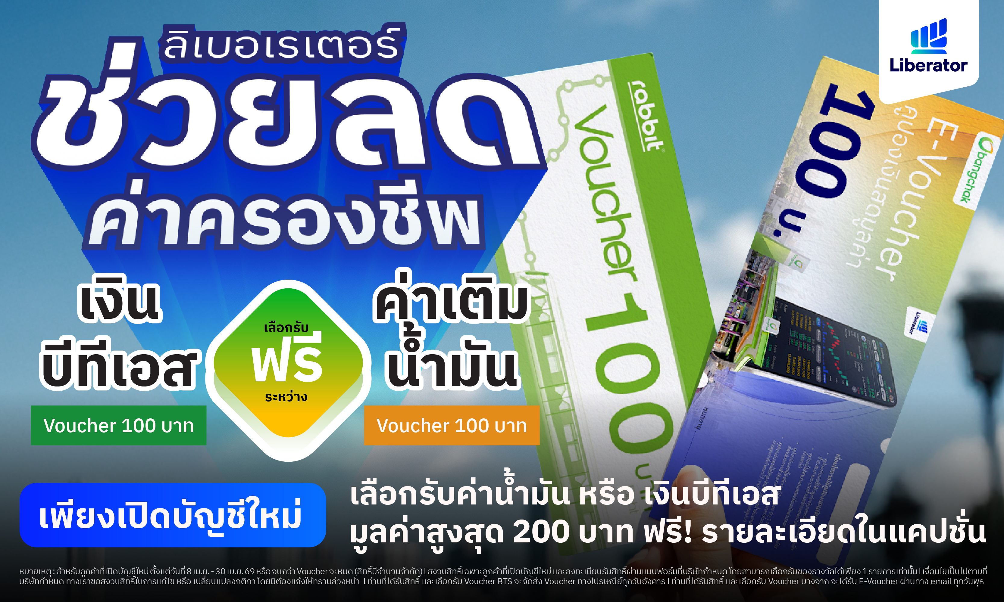 เปิดบัญชี Liberator ใหม่ รับฟรี! Voucher สูงสุด 200 บาท เลือกรับได้ทั้งบัตร BTS หรือ บัตรเติมน้ำมันบางจาก แจกจำนวนจำกัด! สรุปวิธีสมัครและรับสิทธิ์ง่ายๆ ใน 2 สเต็ป รีบคว้าสิทธิ์ก่อนเต็ม อ่านเงื่อนไขที่นี่!