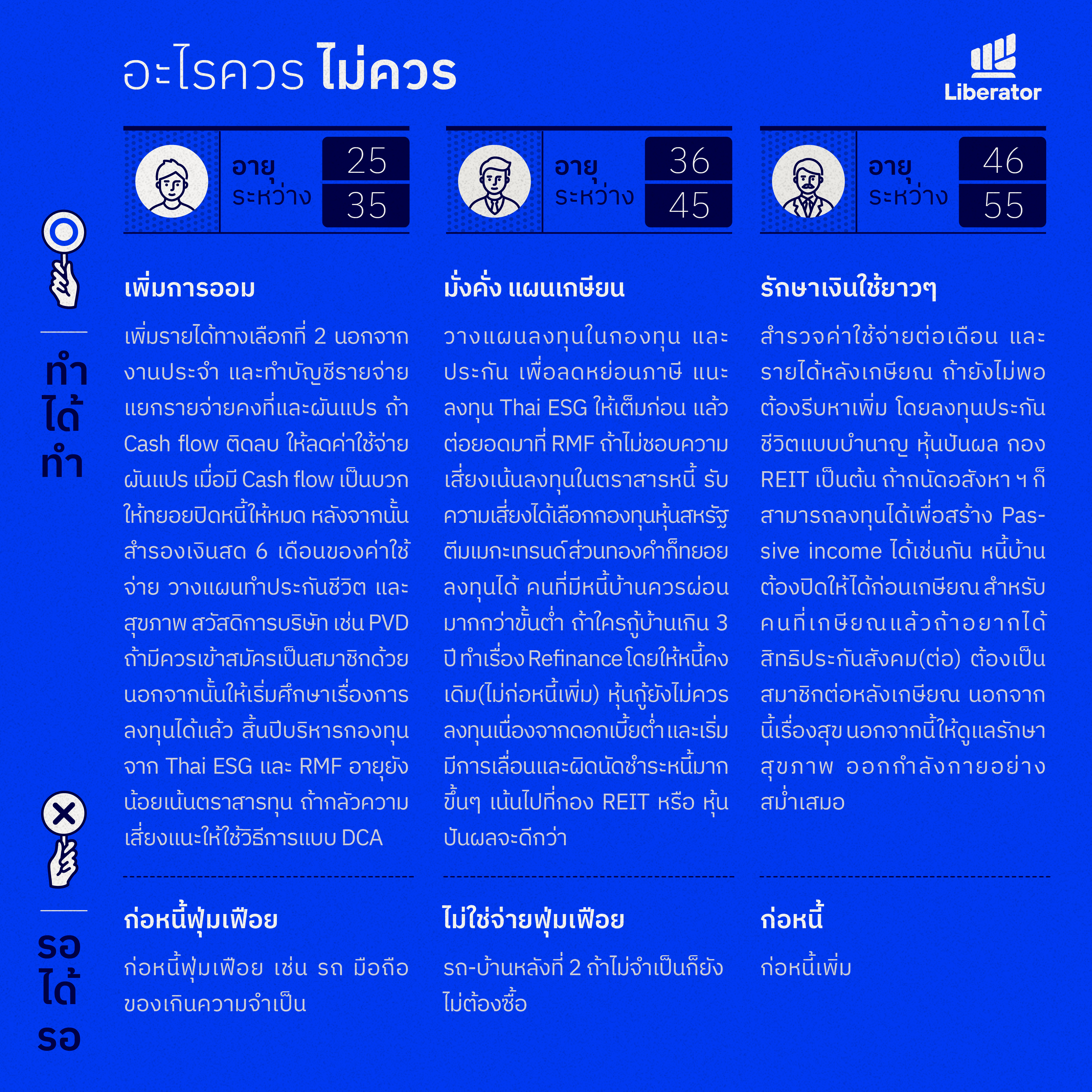 สิ่งที่ไม่ควรทำช่วงนี้ : ก่อหนี้ฟุ่มเฟือย เช่น รถ มือถือ ของเกินความจำเป็น